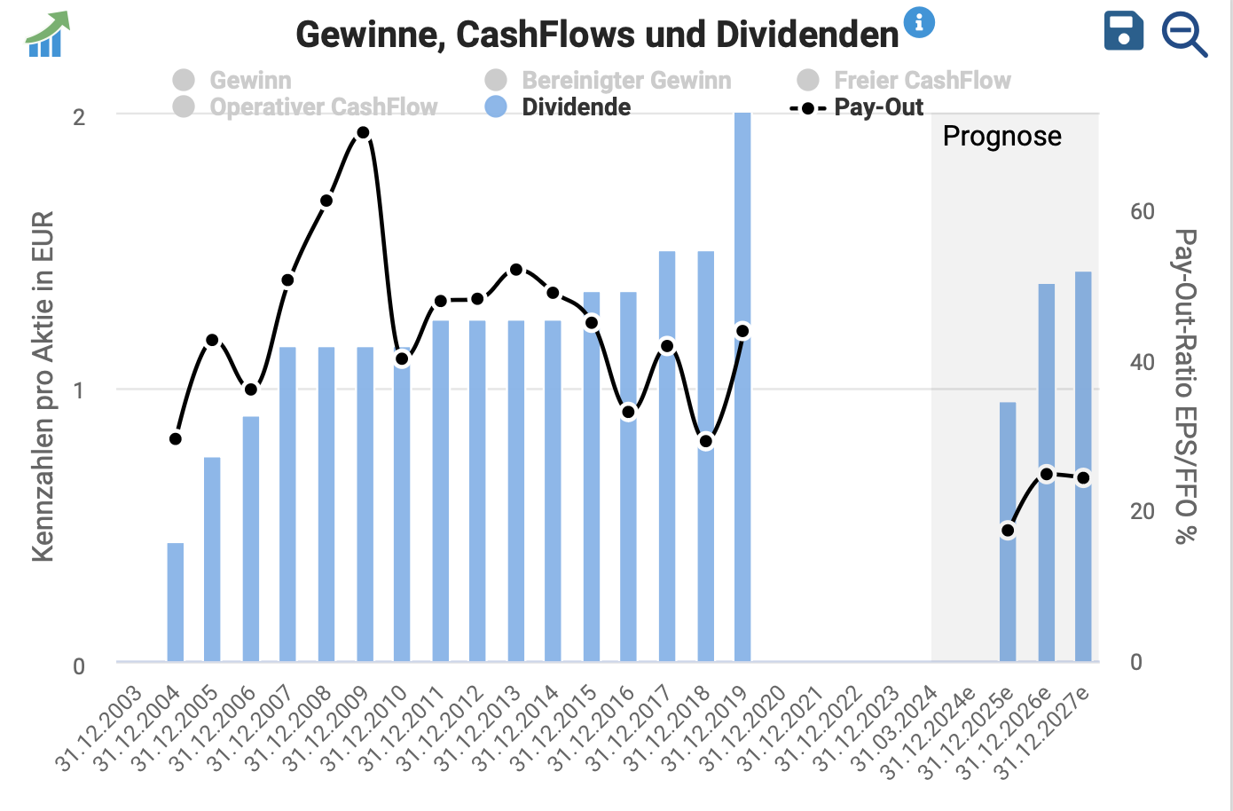 Darum ist die Aktie preiswert: Das derzeit historisch günstige Bewertungsniveau ist auf den 2024 letztmalig negativen Free Cash Flow, die erhöhte Verschuldung und die seit 2019 ausgesetzte Dividende zurückzuführen. Da sich die Investitionsphase dem Ende zuneigt, werden sich alle drei Belastungsfaktoren in den kommenden Jahren schrittweise auflösen. Das dürfte eine Neubewertung anstoßen.