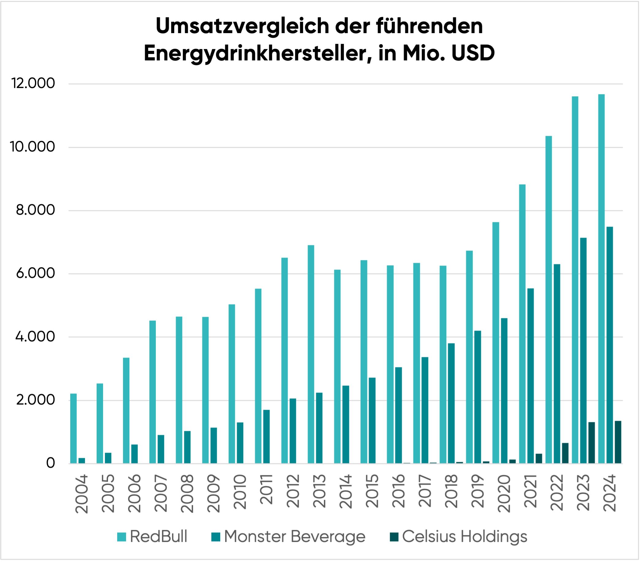 Und schon war Monster Beverage geboren. Zu Beginn der 2000er-Jahre war der Umsatz von Red Bull noch ein Vielfaches höher – doch im Laufe der Zeit konnte der amerikanische Herausforderer immer weiter aufholen.