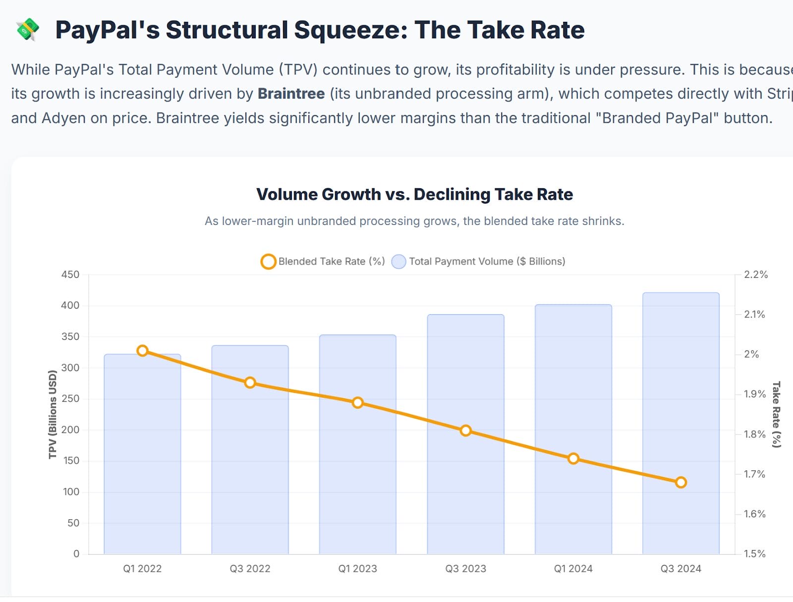 Die „Take Rate“ (Gebühren im Verhältnis zum Transaktionsvolumen) von PayPal sinkt bereits seit geraumer Zeit, da das Wachstum hauptsächlich von Produkten mit niedrigeren Margen kommt.