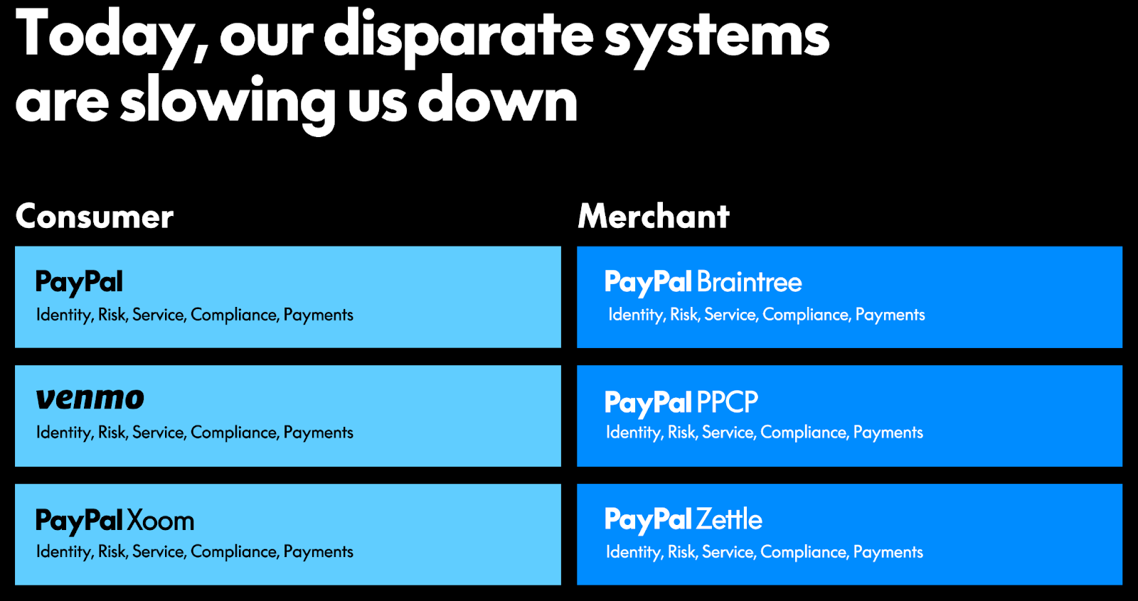 Eines der Hauptprobleme scheint zu sein, dass PayPal mindestens sechs verschiedene Plattformen innerhalb des Unternehmens betreibt.