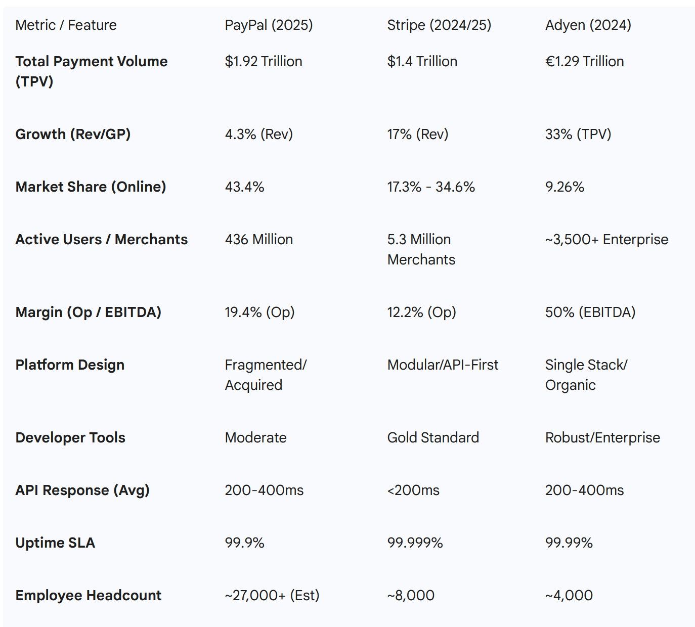Interessant ist zum Beispiel, dass PayPal mehr als doppelt so viele Mitarbeiter beschäftigt wie Stripe und Adyen zusammen.