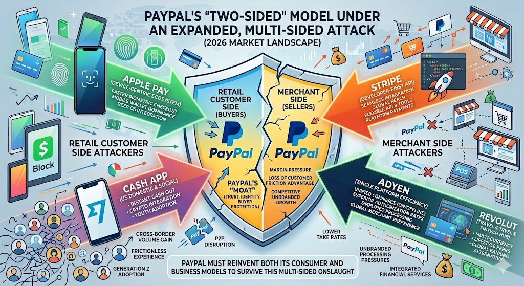 Als zweiseitiger Marktplatz ist PayPal leider auch massiven Umbrüchen und Konkurrenz auf der Seite der Privatkunden ausgesetzt.